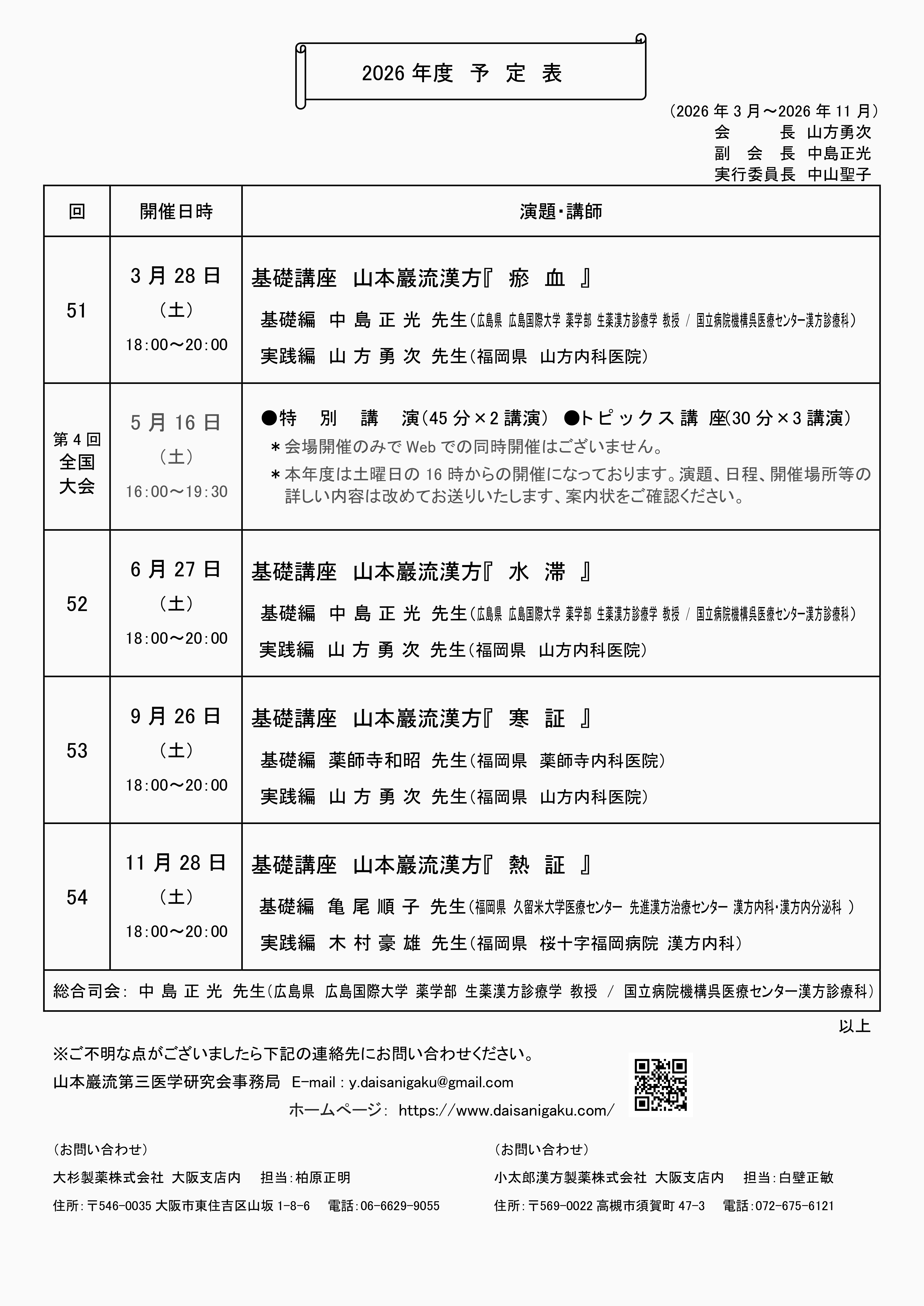 2026年度の山本巌流第三医学研究会の年間予定の概要が決まりました。